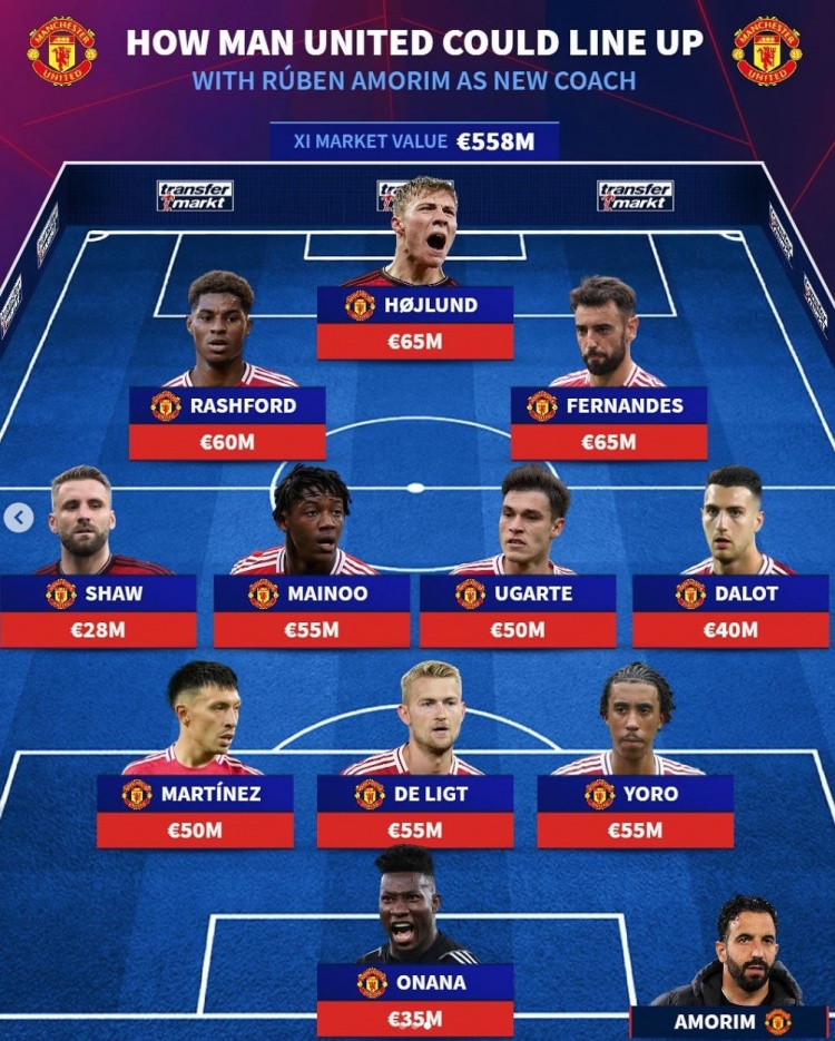 德轉(zhuǎn)預(yù)測阿莫林麾下曼聯(lián)主力陣:總身價5.58億歐元