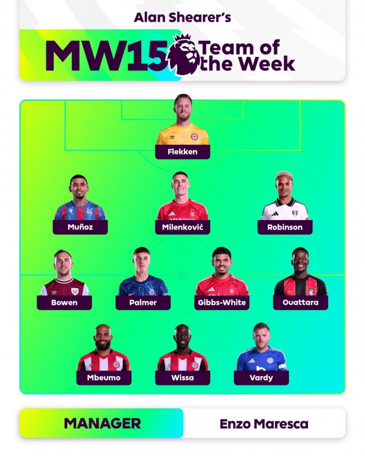 12月10日訊 英超第15輪比賽戰(zhàn)罷,英格蘭足壇名宿希勒評(píng)出了本輪最佳陣容,帕爾默、瓦爾迪在列。
