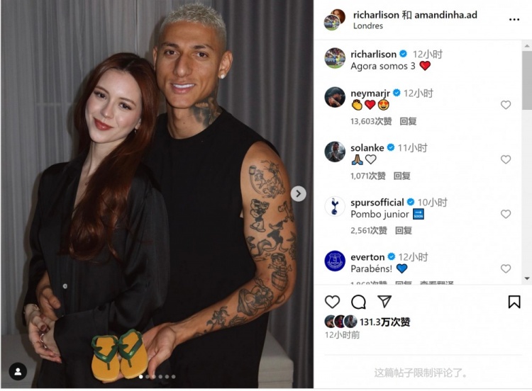 12月11日訊 熱刺前鋒理查利森更新社媒動態(tài),宣布女友阿曼達(dá)懷孕。
