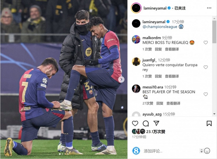 亞馬爾當(dāng)選全場(chǎng)最佳球員,賽后亞馬爾在社交媒體上曬出費(fèi)蘭-托雷斯進(jìn)球后為他擦鞋慶祝的照片,以及自己手拿最佳球員獎(jiǎng)杯的照片,并配文:“歐冠 標(biāo)簽: 足球  西甲  巴塞羅那  歐冠