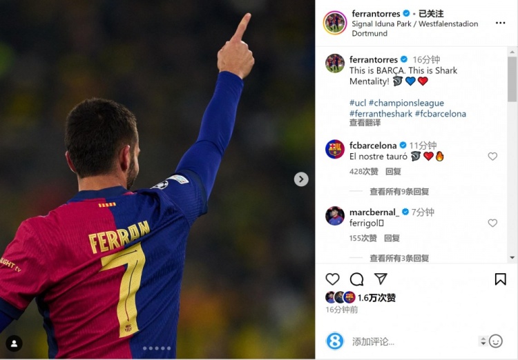 費(fèi)蘭-托雷斯在社交媒體上曬出慶祝進(jìn)球的照片,并寫道:“這就是巴薩,這就是鯊魚心態(tài)。”