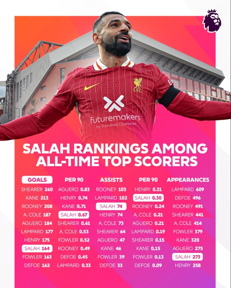到目前為止,薩拉赫總計出戰(zhàn)273場英超比賽,打進164粒進球,平均每90分鐘進球0.67,總計送出74次助攻,平均每90分鐘助攻0.30。
