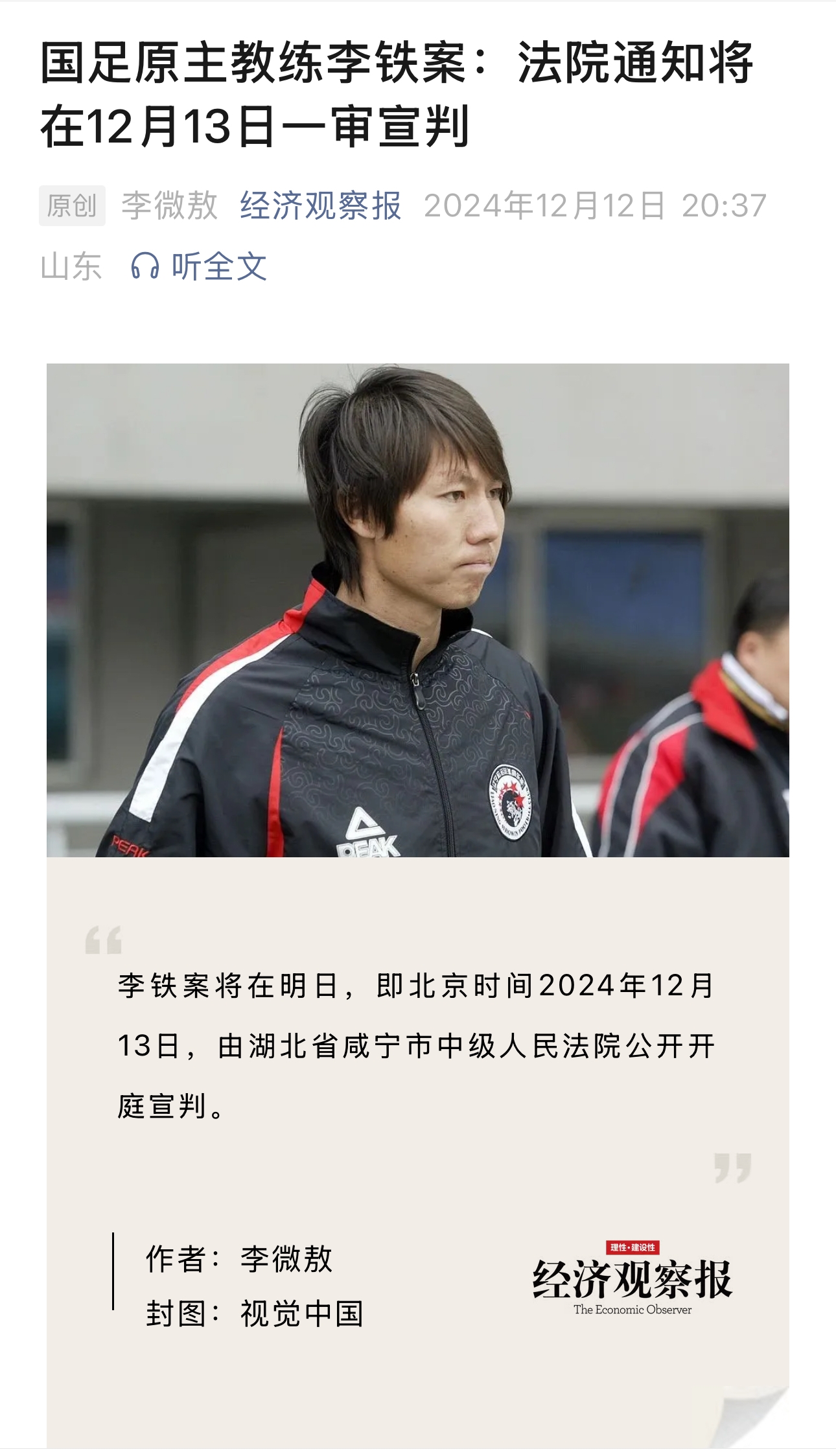 備受關(guān)注的中國國家男子足球隊(下稱“中國男足”)原主教練、知名足球運動員李鐵案,法院已通知其辯護(hù)人,該案將在明日,即北京時間2024年12月13日,由湖北省咸寧市中級人民法院公開開庭宣判。此前法庭的開庭審理中,李鐵雖表示“認(rèn)罪悔罪”,但未做“認(rèn)罪認(rèn)罰”。