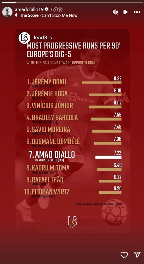11月5日訊 曼聯(lián)邊鋒阿瑪?shù)?迪亞洛更新社媒,曬出了五大聯(lián)賽本賽季球員每90分鐘的加速跑動(dòng)次數(shù)榜單,自己7.22次排名第七。