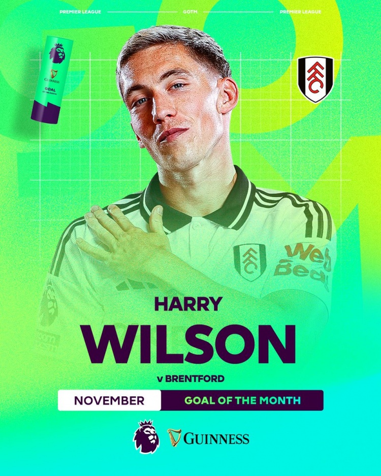 在英超第10輪比賽中,哈里-威爾遜補(bǔ)時(shí)階段連進(jìn)2球,幫助富勒姆主場(chǎng)2-1逆轉(zhuǎn)布倫特福德,他的首粒進(jìn)球是精彩的雜耍式破門,英超官方宣布這記腳后跟吊射當(dāng)選11月最佳進(jìn)球。