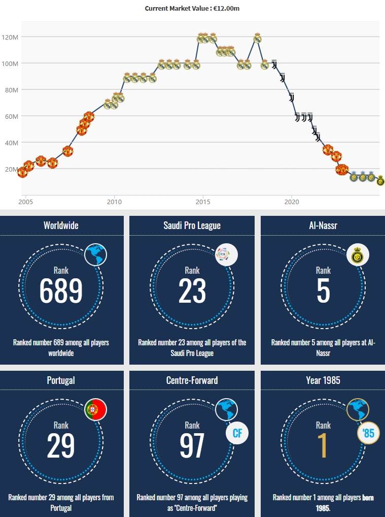 C羅此前的身價為1500萬歐元,39歲的C羅本賽季代表利雅得勝利出戰(zhàn)19場比賽,貢獻16粒進球和3次助攻,C羅的歷史最高身價曾在效力皇馬時達到1.2億歐元。