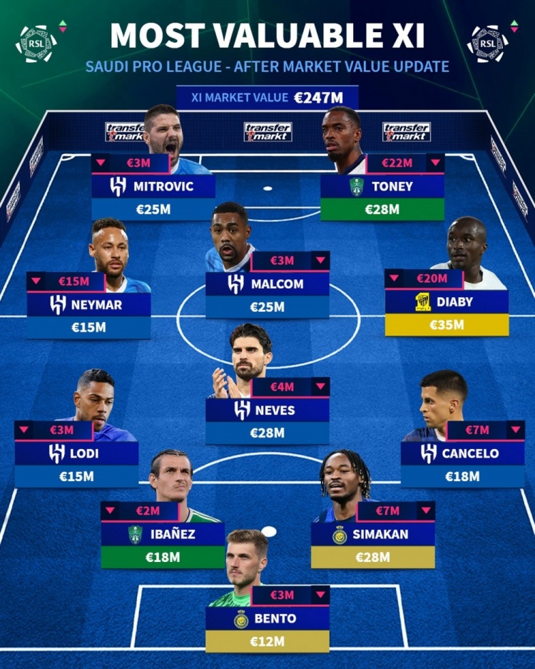 12月14日訊 德國轉(zhuǎn)會市場更新了沙特聯(lián)賽球員的身價,并列出身價最高陣容,內(nèi)馬爾、米特洛維奇、伊萬-托尼在列,總價2.47億歐元。