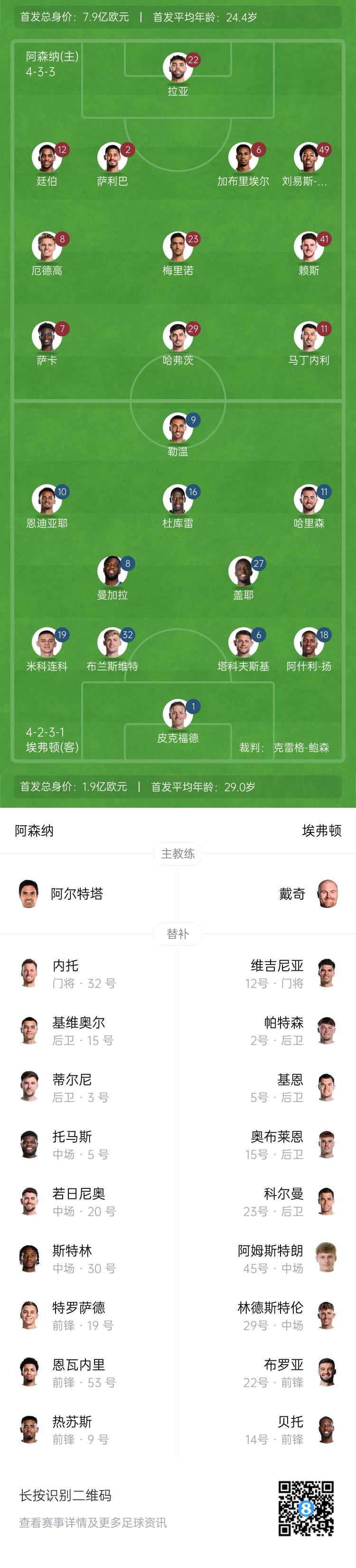 阿森納首發(fā):22-拉亞、12-廷伯、2-薩利巴、6-加布里埃爾、49-斯凱利、23-梅里諾、41-賴斯、8-厄德高、7-薩卡、11-馬丁內(nèi)利、29-哈弗茨