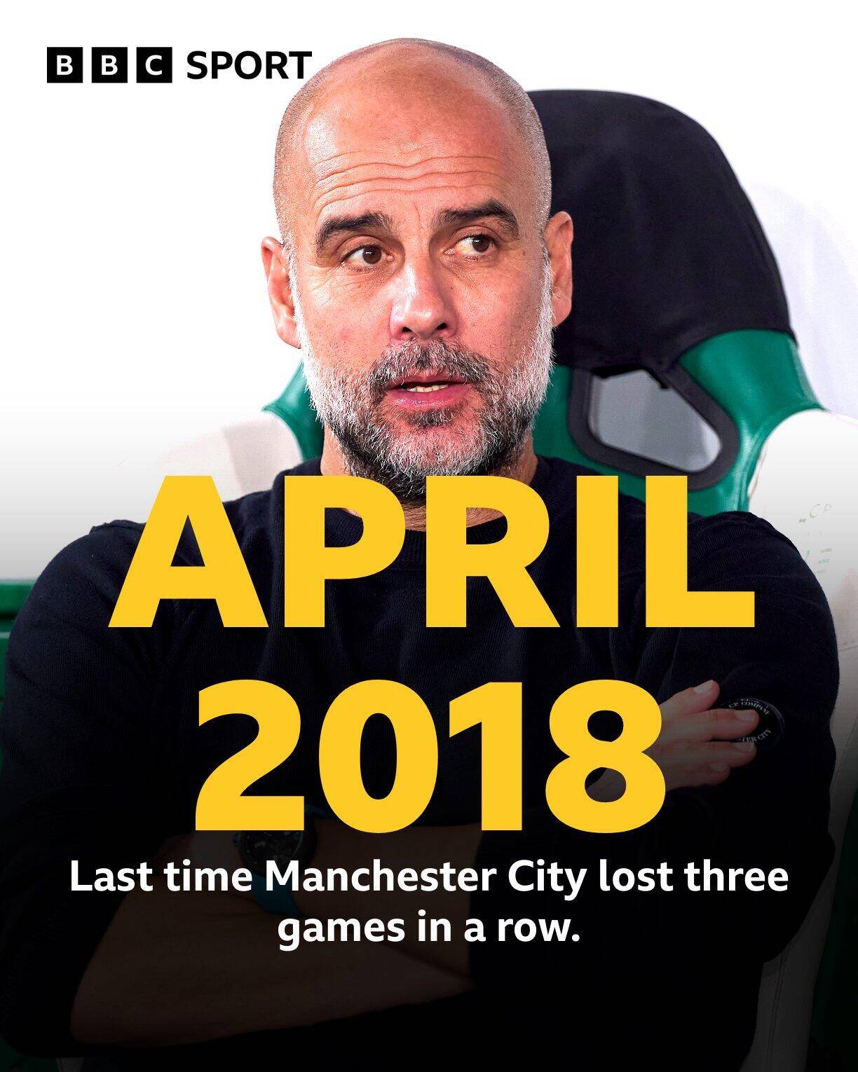 此外,曼城遭遇各賽事3連敗,2018年以來首次。