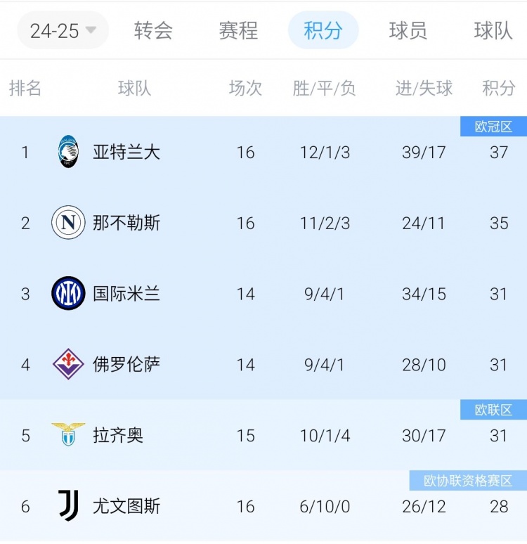少賽一場的拉齊奧15輪吃到了4場敗仗,但憑借10勝1平領(lǐng)先尤文3分。積分榜排名第一、第二的亞特蘭大和那不勒斯,分別都吃到了3敗。
