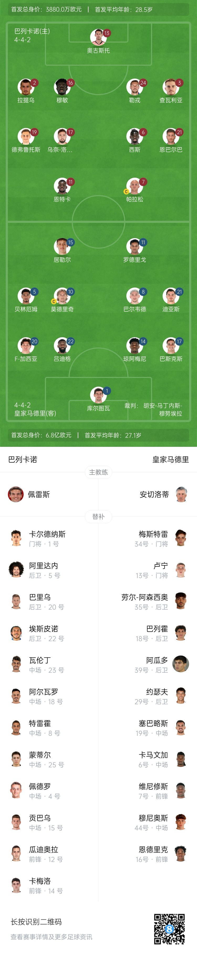 皇馬替補(bǔ):13-盧寧、34-梅斯特雷、6-卡馬文加、7-維尼修斯、16-恩德里克、18-巴列霍、19-塞巴略斯、29-約瑟夫、35-勞爾-阿森西奧、39-洛倫佐-阿瓜多、44-維克托-穆尼奧斯