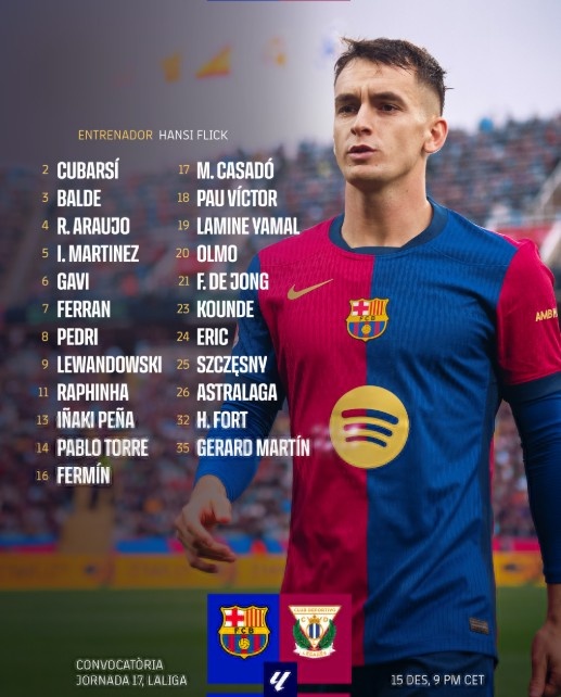 12月15日訊 北京時間12月16日凌晨4:00,2024-25賽季西甲聯(lián)賽第17輪,巴塞羅那將坐鎮(zhèn)主場迎戰(zhàn)萊加內(nèi)斯。賽前巴薩官方公布本場比賽大名單,萊萬領銜鋒線,阿勞霍在列,法蒂繼續(xù)缺席。