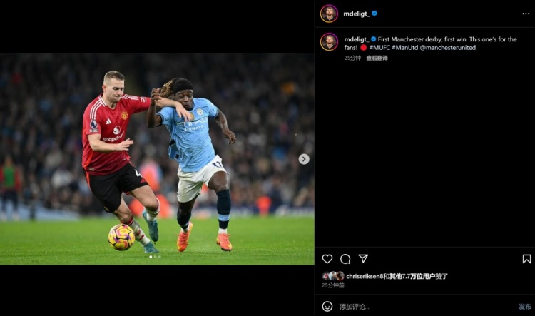 德里赫特曬出自己單防多庫時的照片,并寫道:首場曼市德比,首場勝利。這場勝利獻(xiàn)給球迷們!