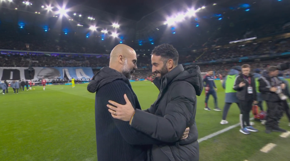 12月16日訊 曼城vs曼聯(lián)焦點(diǎn)對(duì)決即將打響,賽前雙方人員入場(chǎng),瓜迪奧拉和阿莫林在通道口握手擁抱致意。