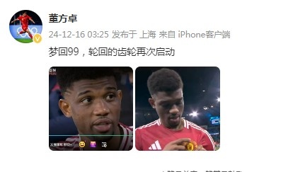 12月16日訊 在曼聯(lián)客場(chǎng)2-1逆轉(zhuǎn)絕殺曼城后,曼聯(lián)舊將董方卓在社媒表達(dá)了他的感受。