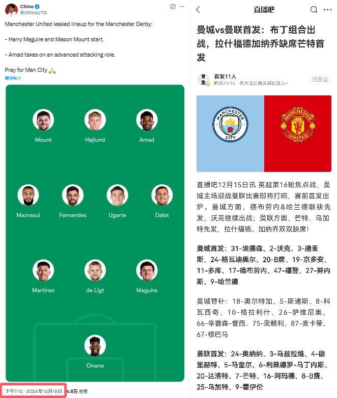 在曼市德比賽前數(shù)小時(shí),曼聯(lián)的首發(fā)被泄露,且與官方首發(fā)完全相同。