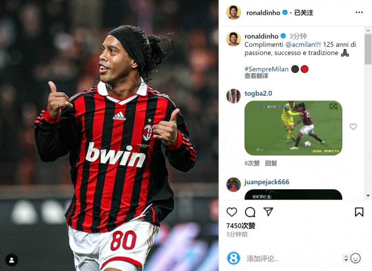 12月16日訊 羅納爾迪尼奧社媒發(fā)文,祝賀老東家米蘭迎來俱樂部成立125周年紀念日。