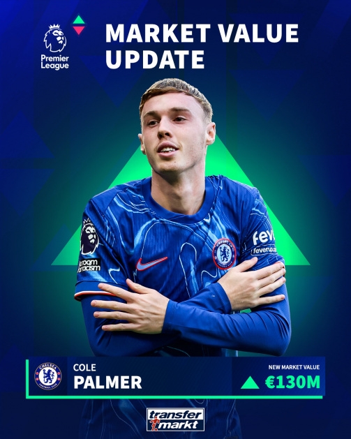 12月16日訊 德轉(zhuǎn)更新英超身價(jià),22歲帕爾默暴漲4000萬,漲至1.3億歐元!