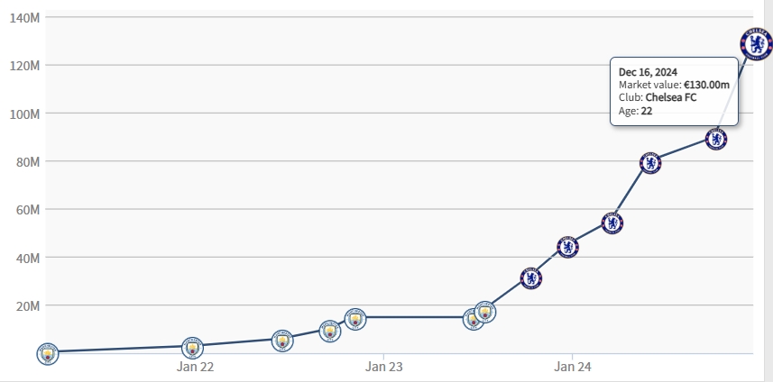 22歲的帕爾默上賽季以4700萬歐加盟切爾西,當(dāng)時(shí)他的身價(jià)“只有”1800萬歐元,加盟以來,帕爾默的身價(jià)6連漲,目前已經(jīng)達(dá)到了1.3億歐元,這一數(shù)字接近切爾西為他支付轉(zhuǎn)會費(fèi)的2.8倍。
