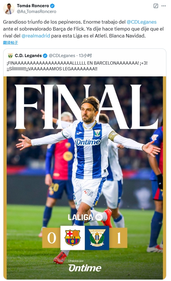 阿斯報(bào)主編龍塞羅轉(zhuǎn)發(fā)了萊加內(nèi)斯官推的戰(zhàn)報(bào),寫道:壯麗的勝利屬于小黃瓜隊(duì)。萊加內(nèi)斯對(duì)被被高估的弗里克領(lǐng)導(dǎo)的巴薩做出了巨大努力。我早就說過,這個(gè)賽季皇馬的對(duì)手是馬競。
