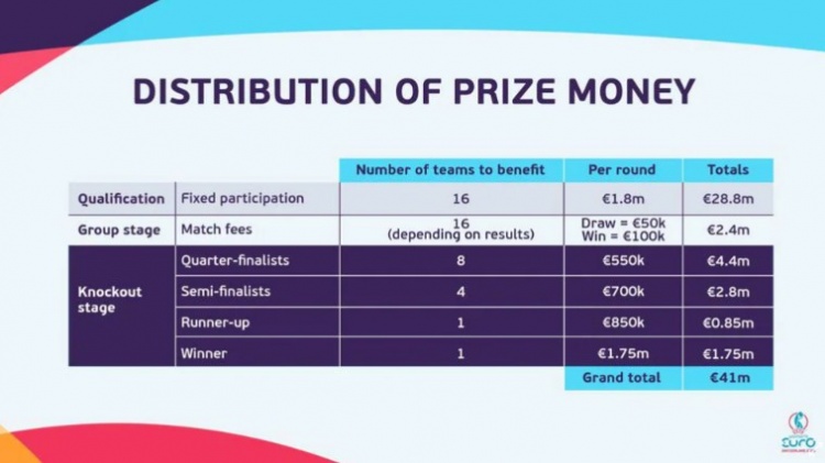 4100萬歐元獎(jiǎng)金當(dāng)中,所有16支參賽隊(duì)伍都將獲得180萬歐元參賽費(fèi)用,小組賽勝者額外獲得10萬歐元,平局雙方各獲得5萬歐元。參加淘汰賽的球隊(duì)也將獲得梯度獎(jiǎng)金,分別為(每次晉級(jí)獎(jiǎng)金疊加):