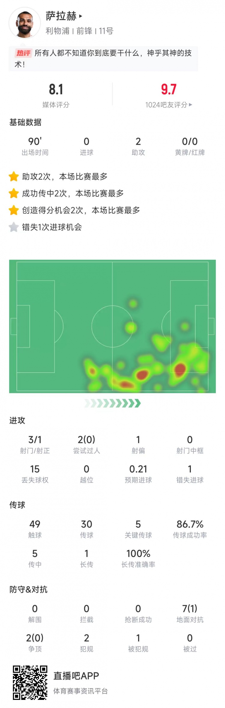 薩拉赫本場比賽數(shù)據(jù):
