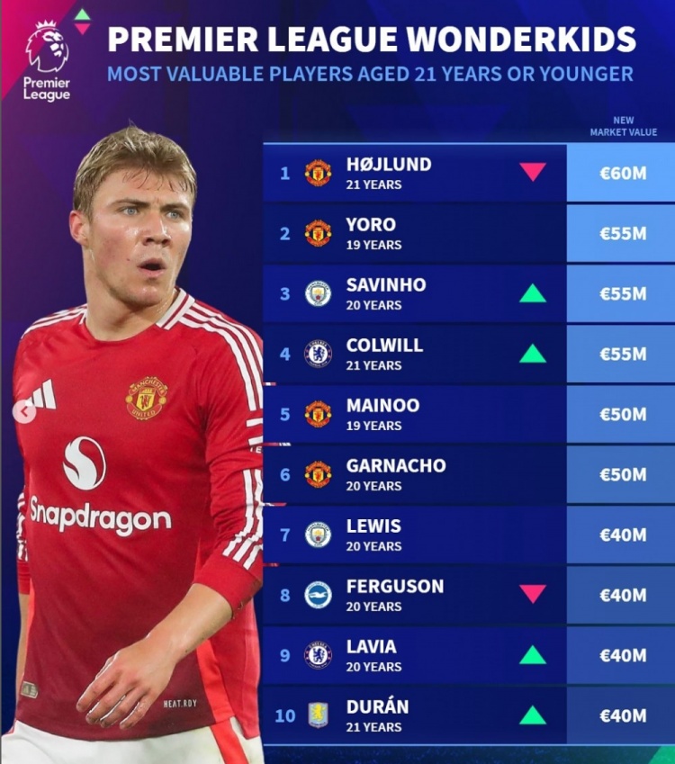 12月17日訊 《轉(zhuǎn)會(huì)市場(chǎng)》在今日更新了英超球員身價(jià),并列出了U21球員身價(jià)榜,曼聯(lián)4將在列。