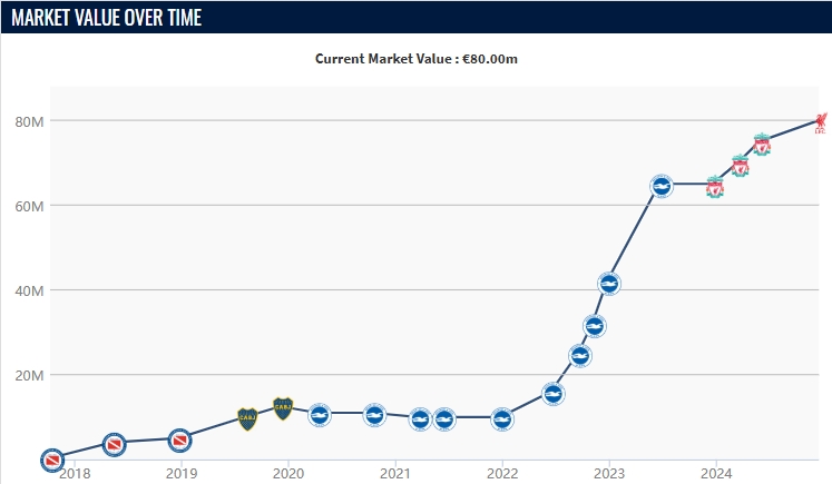 麥卡加盟利物浦后,身價(jià)呈現(xiàn)不斷上漲趨勢,是紅軍重建中場的重要核心,能踢10號(hào)位、8號(hào)位、6號(hào)位。
