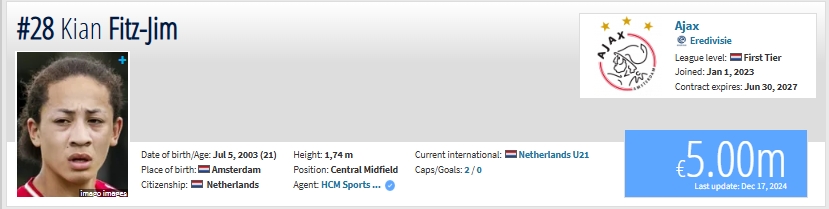 12月17日訊 德轉(zhuǎn)荷甲身價(jià)今日更新,來(lái)自阿賈克斯的21歲華裔球員菲慈佔(zhàn)-天樂(lè)最新身價(jià)為500萬(wàn)歐。