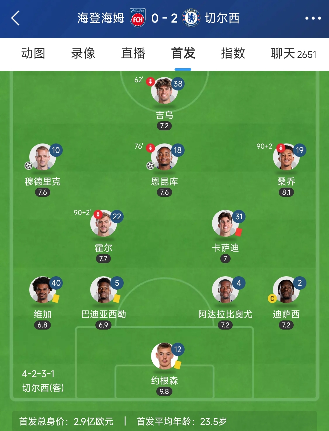 11月29日切爾西2-0海登海姆首發(fā)