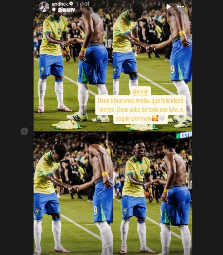 恩德里克曬出自己在巴西國家隊和維尼修斯的互動照,并配文:“上帝是多么仁慈,我的兄弟。我真是太高興了!”