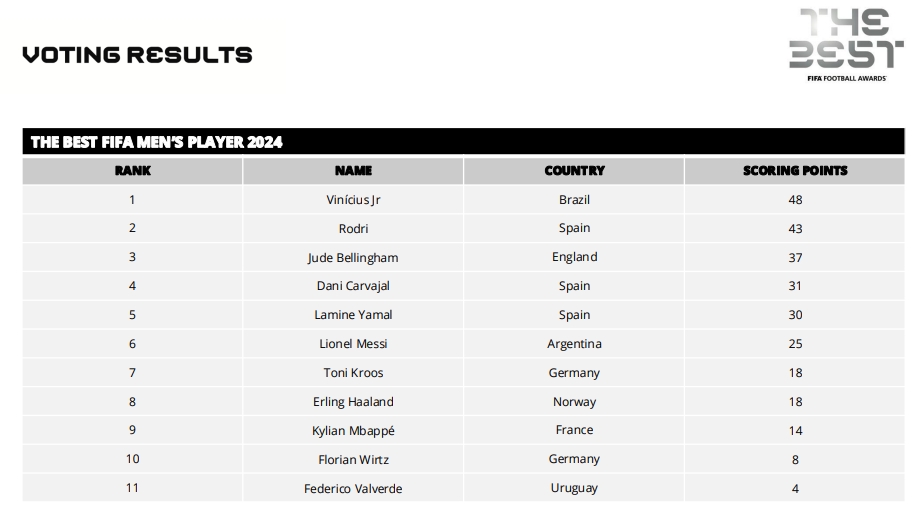 12月18日訊 FIFA年度頒獎典禮結束,維尼修斯當選年度最佳球員(世界足球先生),F(xiàn)IFA官方剛剛公布了得票情況。
