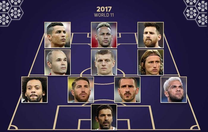 門將:布馮(意大利);后衛(wèi):馬塞洛(巴西)、拉莫斯(西班牙)、博努奇(意大利)、阿爾維斯(巴西);中場:伊涅斯塔(西班牙)、克羅斯(德國)、莫德里奇(克羅地亞);前鋒:C羅(葡萄牙)、內馬爾(巴西)、梅西(阿根廷)