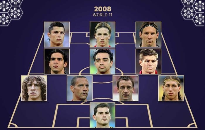 門將:卡西利亞斯(西班牙);后衛(wèi):普約爾(西班牙)、費迪南德(英格蘭)、特里(英格蘭)、拉莫斯(西班牙);中場:卡卡(巴西)、哈維(西班牙)、杰拉德(英格蘭);前鋒:C羅(葡萄牙)、托雷斯(西班牙)、梅西(阿根廷)