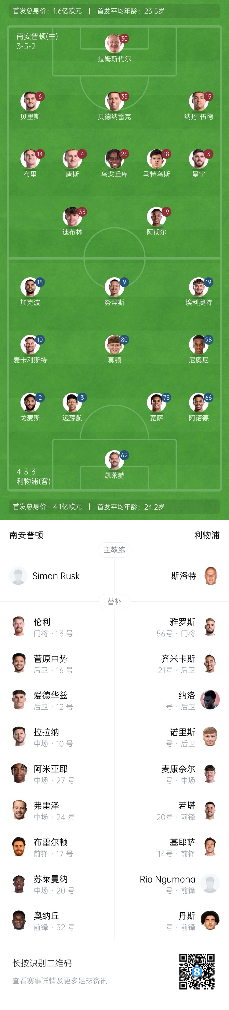 南安普頓替補(bǔ):13-朗姆利、12-羅尼-愛德華茲、16-菅原由勢、10-拉拉納、24-弗雷澤、27-阿莫-阿梅約、20-蘇萊馬納、17-布雷爾頓-迪亞茲、32-奧納丘