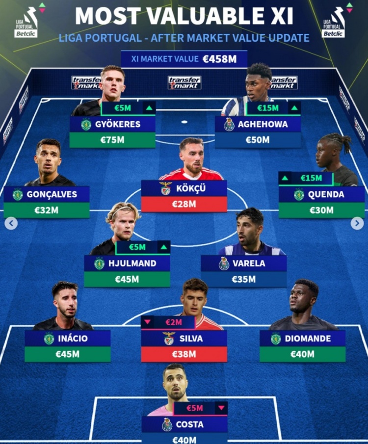 12月20日訊 《轉(zhuǎn)會(huì)市場(chǎng)》更新了葡超球員身價(jià),并列出了一套葡超最貴陣,葡體6將在列。