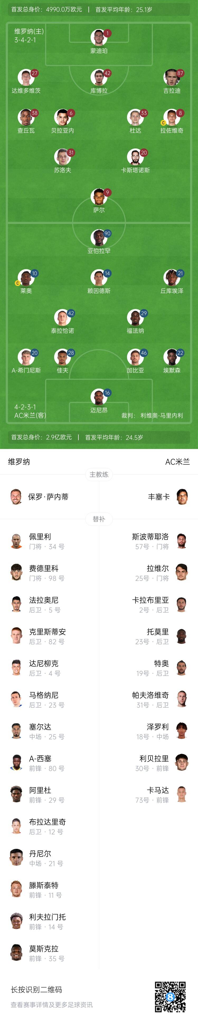 維羅納首發(fā):1-蒙迪珀、27-戴維多維茨、42-科波拉、87-吉拉迪、38-查丘瓦、20-卡斯塔諾斯、33-杜達、6-貝拉亞內(nèi)、8-拉佐維奇、31-蘇洛夫、9-薩爾