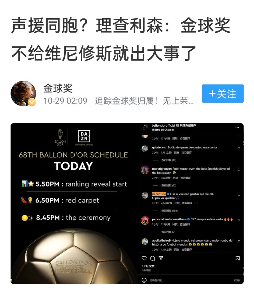 在2024金球典禮夜,理查利森曾在社媒留言:“如果金球獎不給維尼修斯,那就要出事兒了。”而就在那天之后,曼城開啟了連敗。