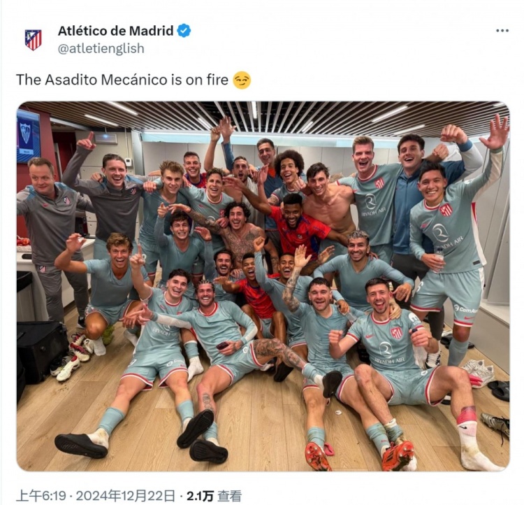 賽后馬競(jìng)官方更新社媒動(dòng)態(tài),曬出全隊(duì)在更衣室內(nèi)的合照,配文:“馬競(jìng)狀態(tài)正佳?!?/p>