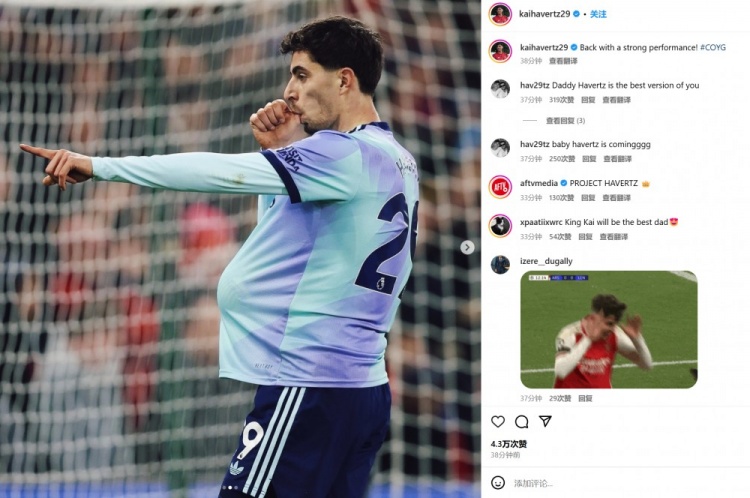 哈弗茨也在賽后通過社媒曬出自己的慶祝照,并配文:“強勢回歸!”
