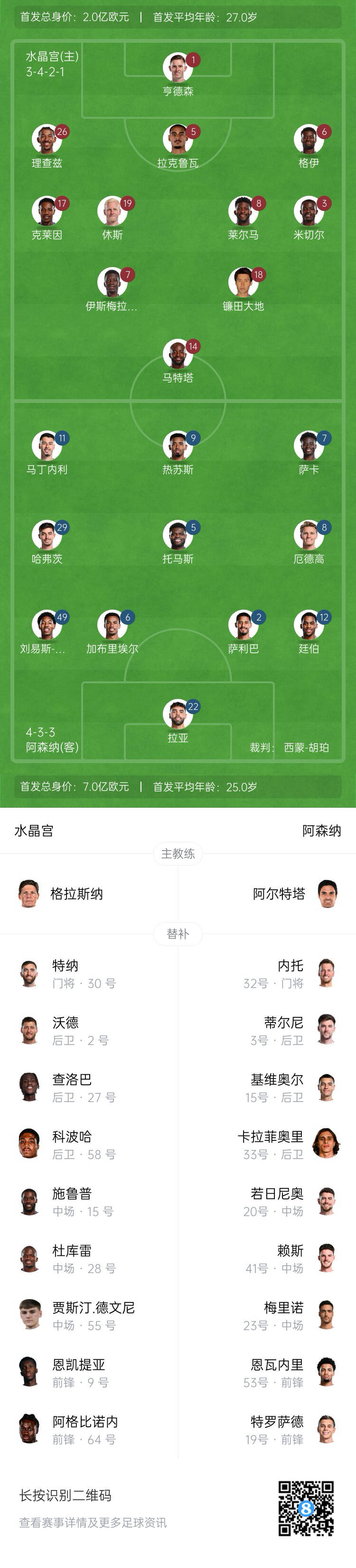 水晶宮首發(fā):1-迪恩-亨德森、17-克萊因、26-克里斯-理查茲、5-拉克洛瓦、6-格伊、3-米切爾、8-萊爾馬、19-威爾-休斯、18-鐮田大地、7-伊斯梅拉-薩爾、14-馬特塔