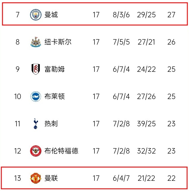 英超第17輪結(jié)束后,曼城第7,曼聯(lián)第13,兩隊排名相差6名。