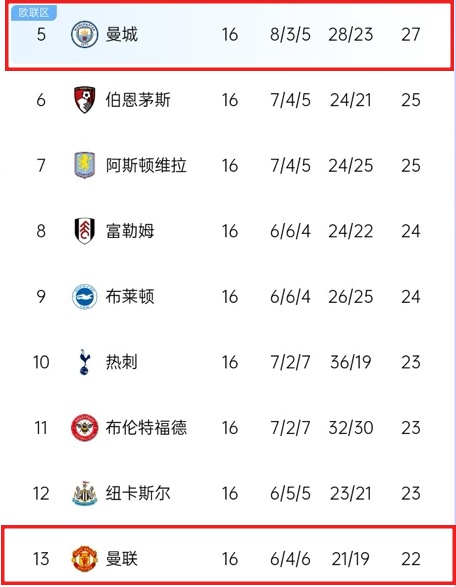 英超第16輪結(jié)束后,曼城第5,曼聯(lián)第13,兩隊排名相差8名。