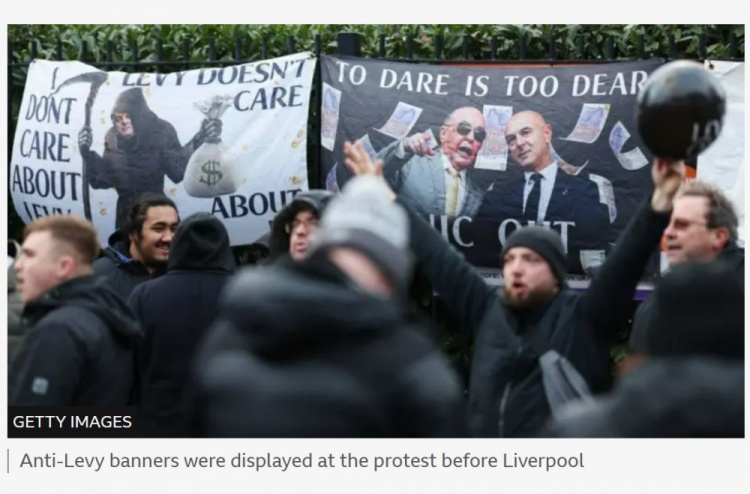 12月23日訊 英超第17輪焦點戰(zhàn),熱刺主場對陣?yán)锲帧?jù)BBC報道,熱刺球迷發(fā)起了反對主席列維的抗議活動,有250-300人參加。