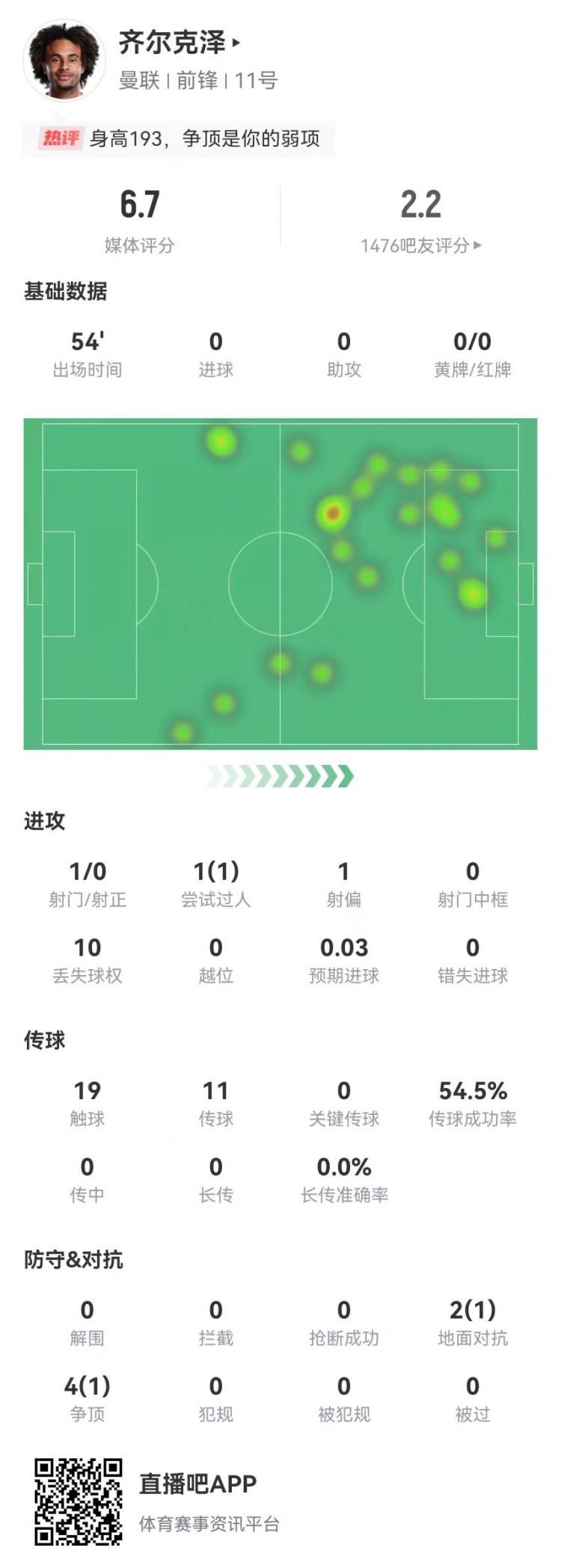 12月23日訊 曼聯(lián)在本輪英超0-3完敗伯恩茅斯,齊爾克澤本場數(shù)據(jù)如下: