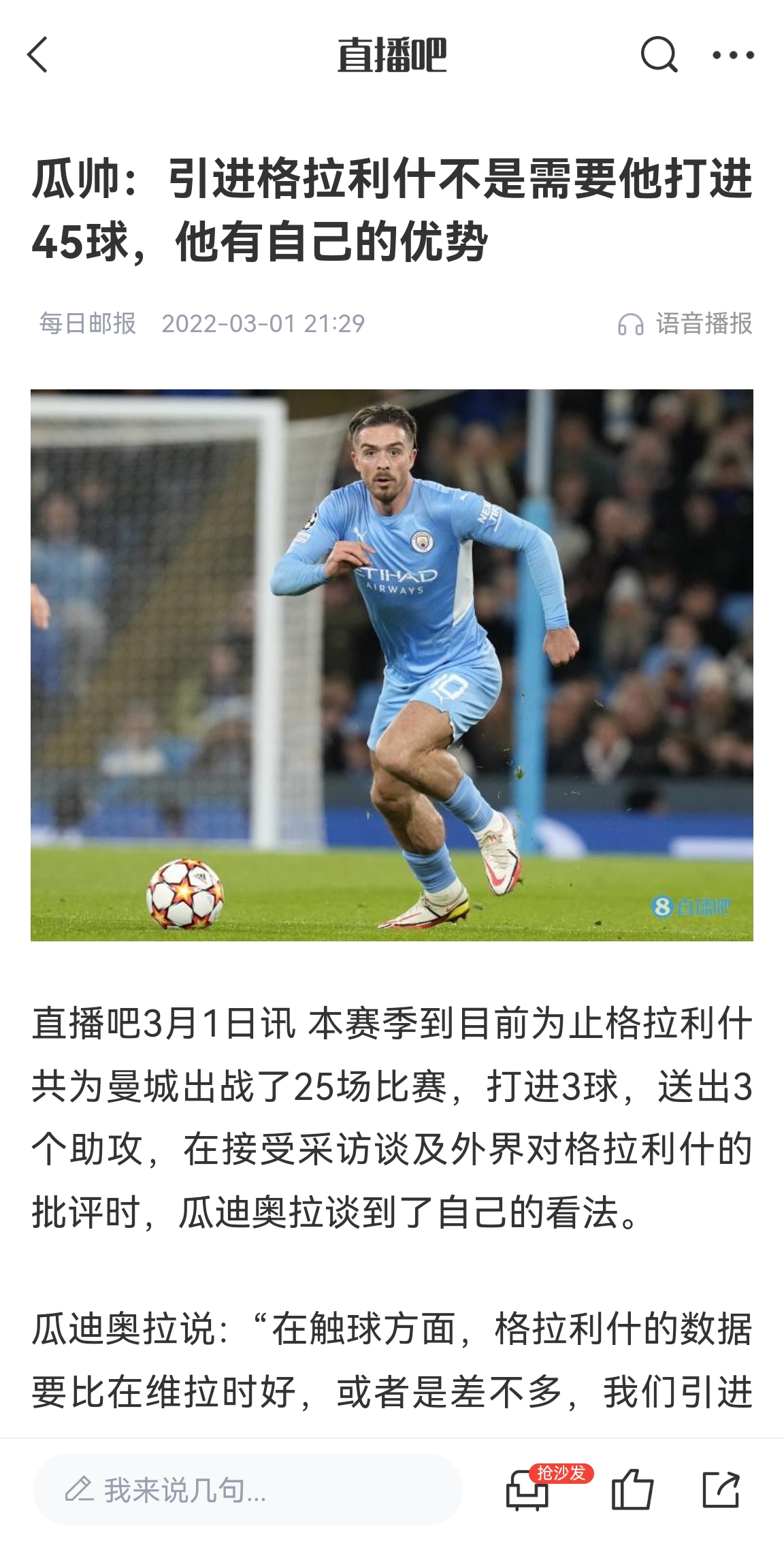 2022年3月,瓜迪奧拉曾這樣談到格拉利什的球荒:“我們引進他不是要讓他打進45球,他不是那樣的特點,他有自己的優(yōu)勢。
