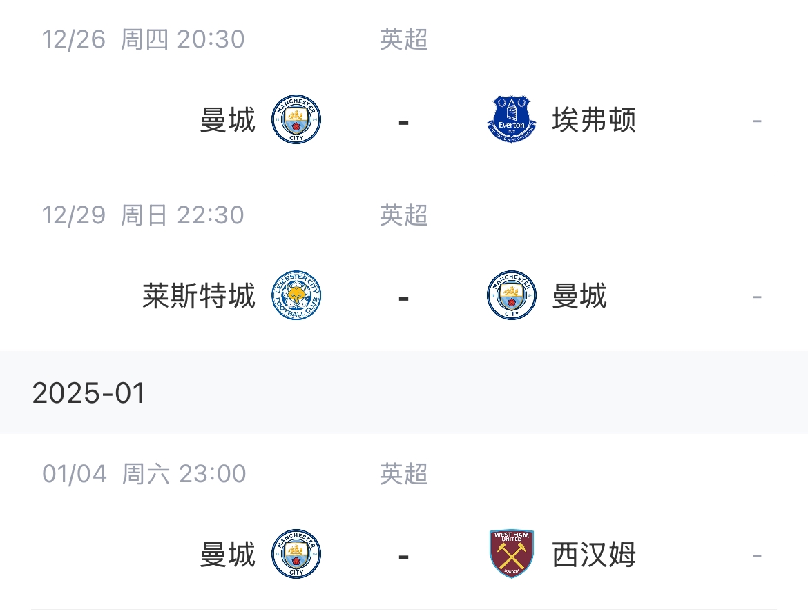 接下來10天,曼城將出戰(zhàn)3場英超,對手分別是排名第15的埃弗頓、第17的萊斯特城和第14的西漢姆。埃弗頓近8場1勝5平2負(fù),萊斯特近10場1勝2平7負(fù),西漢姆近8場2勝3平3負(fù)。