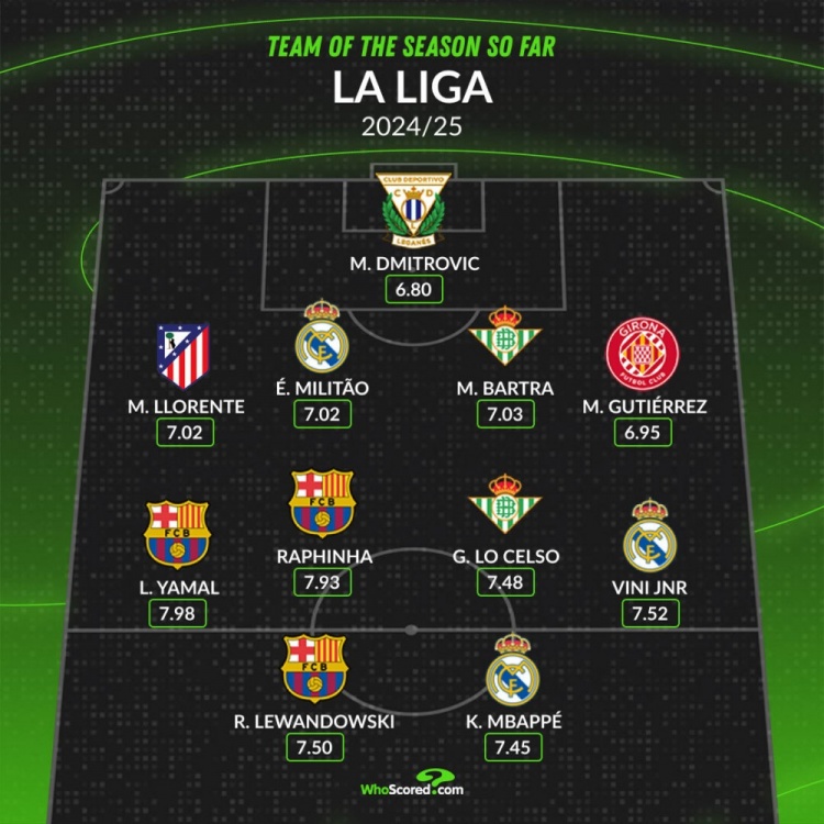 12月24日訊 西甲迎來休賽期,Whoscored評(píng)選了賽季至今的最佳陣容,皇馬、巴薩各3人入圍,萊萬、姆巴佩、亞馬爾、維尼修斯在列。