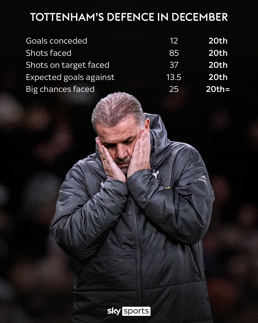 但熱刺的防守并不令人放心,12月以來他們多項防守數(shù)據(jù)在英超聯(lián)賽墊底。