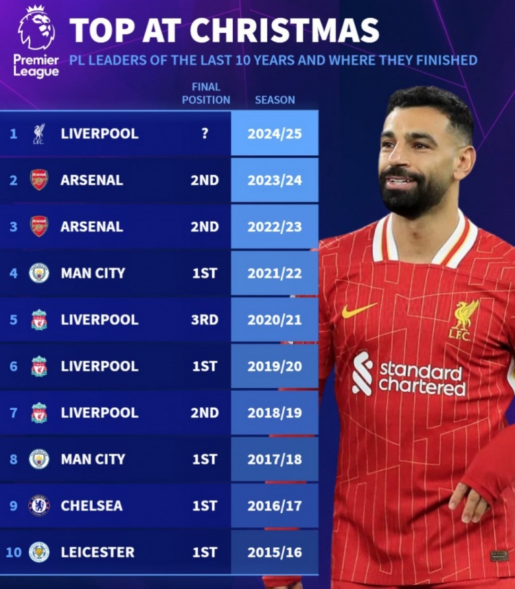 12月24日訊 利物浦在本輪英超大勝熱刺,他們也以圣誕冠軍身份迎來新年。數(shù)據(jù)統(tǒng)計(jì)顯示,英超近9年圣誕冠軍最終5次奪冠。